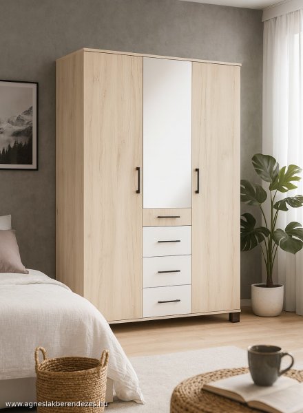 Praktikus kisméretű tükrös gardrób, fiókokkal.Egyedi igény szerint variálható színkombinációk: Korpusz és front: Justus tölgy, katthult és sötét justus tölgy, fiókelők: magasfényű fehér-bézs-antracit és fekete.