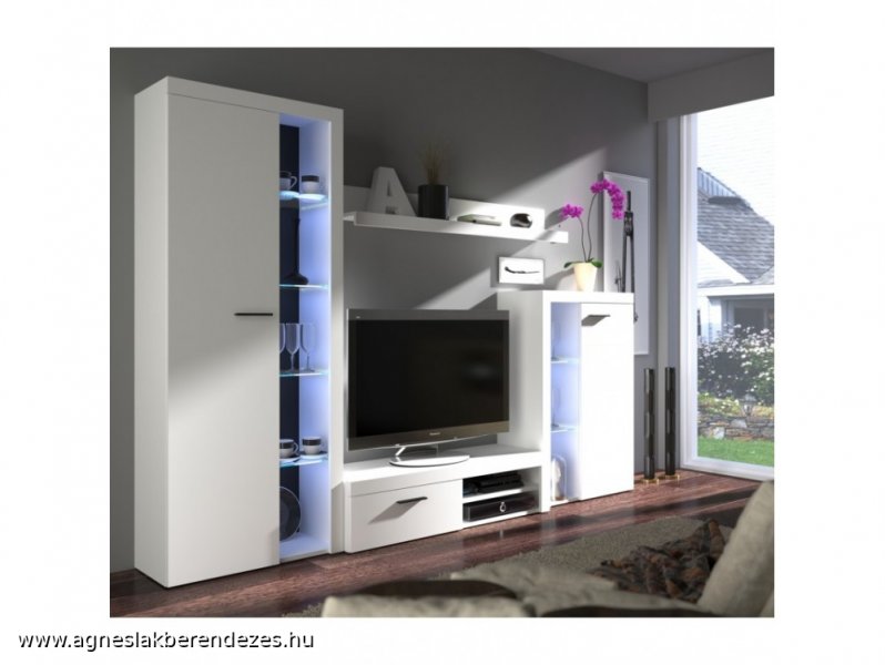 Modern nappali szekrénysor kék LED világítással és MDF extra magasfényű fronttal. Rendelhető színek: fehér/fekete, fehér/fehér.