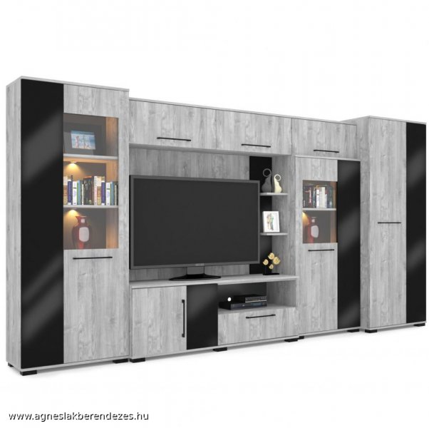 Modern szekrénysor rengeteg pakolási lehetőséggel. Üvegajtók mögött az üvegpolcok LED világítással felszerelve. Rendelhető szín: San Remo tölgy,