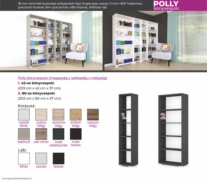 Remek tárolóhelyet biztosít nem csupán a könyvek, de a különböző dekorációs tárgyak számára is. Több színben kapható: rusztik fehér, katthult, sonoma tölgy, artisan tölgy, san remo, canyon tölgy, matt sötétszürke, matt fekete és justus tölgy.