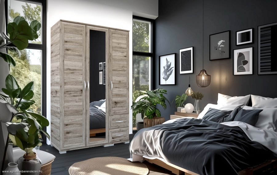 Praktikus, jól pakolható szekrénysor két akasztós szekrénnyel. Szín: sonoma tölgy, matt sötétszürke, vagy fehér üvegkeret és fiók elő.