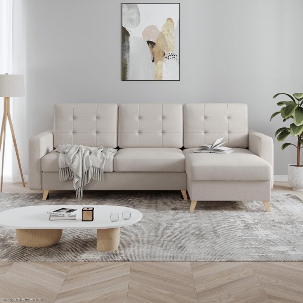 Hullámrugós ülőfelülettel, bonellrugós háttámlával, ágyneműtartóval, ágy funkcióval, kárpitozott háttámlával, vendégágy a saját szövetével kárpitozva. Jobbos vagy balos irányban rendelhető. Fekvőfelület: 140 x 210 cm