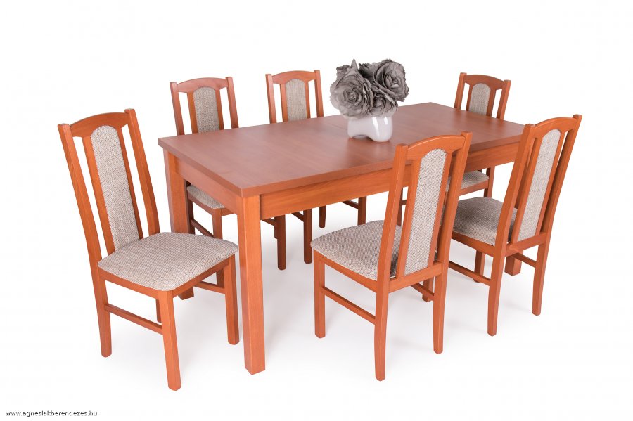 ROMÁNC szék és karosszék: Masszív bükkfa váz, ülés és támla kárpitozott, csapozott kivitel. EURÓPA asztal: Bükk furnérozott, három vendéglappal bővíthető, pácolt, lakkozott, étkező asztal. élek keményfa léccel lezárva. méret (nyitva) 3x39-es vendéglappal 275x100 cm Színminta alapján különböző pácolással rendelhető: Éger, mahagóni, cseresznye, pácolt tölgy, wenge, barna, olasz alma ill. natur bükk.