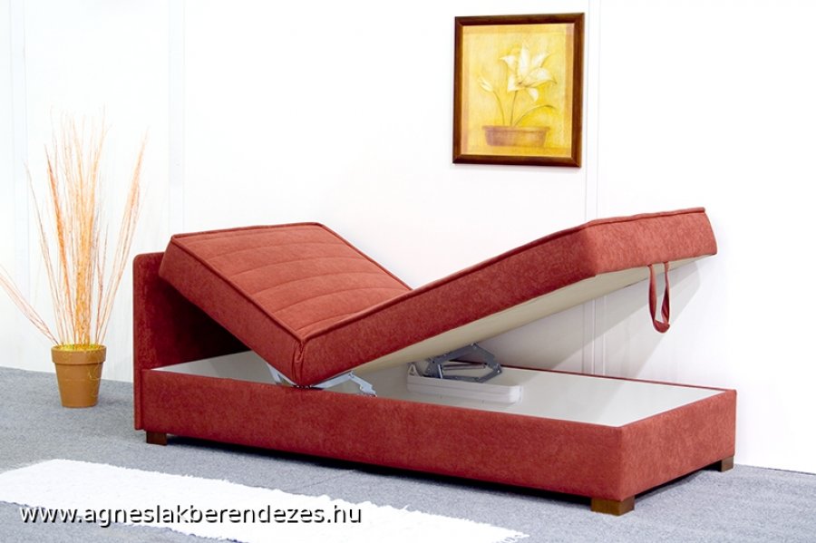 Gömbölyded formavilágú, fiatalos heverő. Fejvég felől 5 magassági fokozatban állítható. Magas komfort fokozatát a farugókon elhelyezett bonell rugózat biztosítja. Nagy méretű ágyneműtartóval rendelkezik. 3 színben rendelhető. Fekvőfelület magassága:43cm
