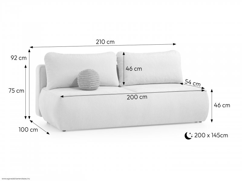 Teljes felülete kárpitozott, választható, minőségi szövet bevonat - változatos színvilággal, magas kényelmi komfortját a fekvőfelület rugóteste adja, nagyméretű, elölről nyíló ágyneműtartóval rendelkezik, 11 cm magas lábak (választható fa vagy fém), robotporszívó is befér alá, választható, 3 féle fekvőfelület: normál keménységű bonellrugózat, nagy keménységű /erősített bonellrugózat, magas kényelmi komfortú táskarugózat, tartozék: 5 db nagyméretű díszpárna. Fekvőfelület: 202x98cm Fekvővelület magassága:55cm