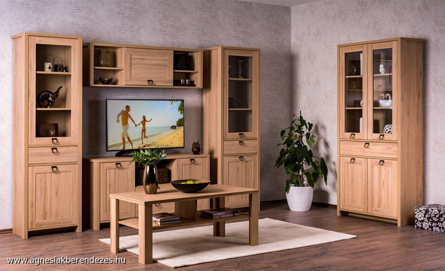 Felül egy üvegajtós, alul egy teli-ajtós polcos szekrény, középen csillapítós fiókkal. Rendelhető jobbos és balos kivitelben.Szín: spanyol tölgy, világos monaco tölgy