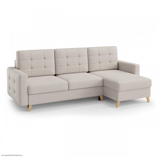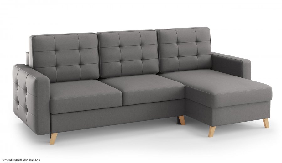 Divatos, kompakt méretű, ággyá alakítható, ágyneműtartós sarokgarnitúra. Hullámrugós ülőfelülettel és bonellrugós háttámlával, ágyneműtartóval, ágy funkcióval, automata nyitási mechanizmussal, kárpitozott háttámlával, díszvarrással, vendégágy a saját szövetével kárpitozva. Számos szövettel rendelhető. Univerzális.
