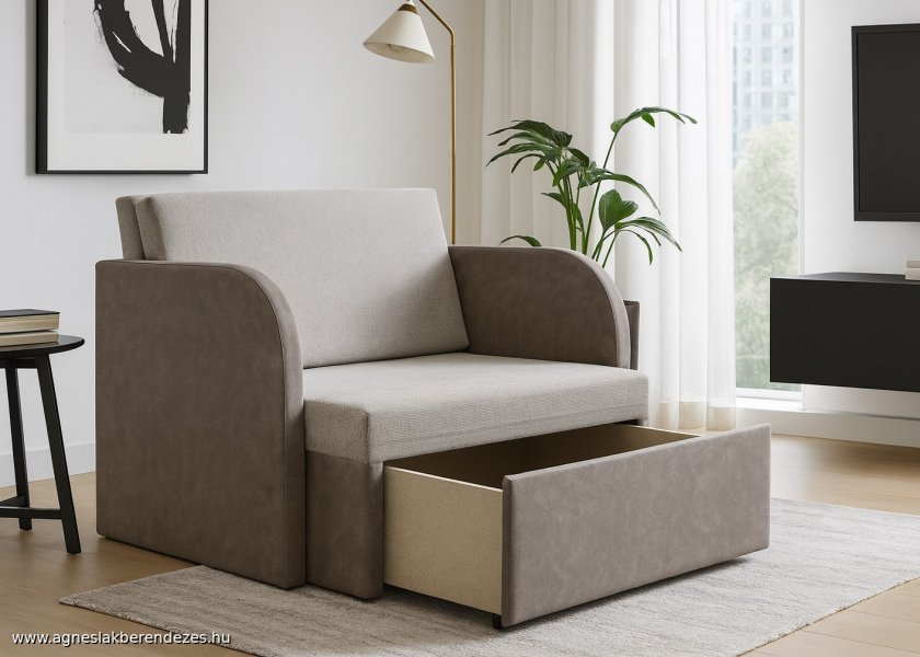 Kihúzható karfás fotelágy szivacsos kivitelben, ágyneműtartó fiókkal. Szövetminta alapján rendelhető.