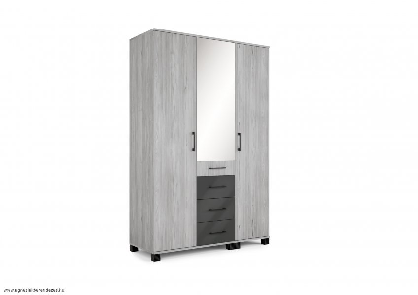 Praktikus kisméretű tükrös gardrób, fiókokkal.Egyedi igény szerint variálható színkombinációk: Korpusz és front: Justus tölgy, katthult és sötét justus tölgy, fiókelők: magasfényű fehér-bézs-antracit és fekete.