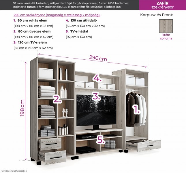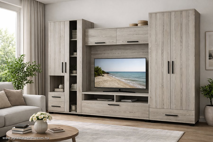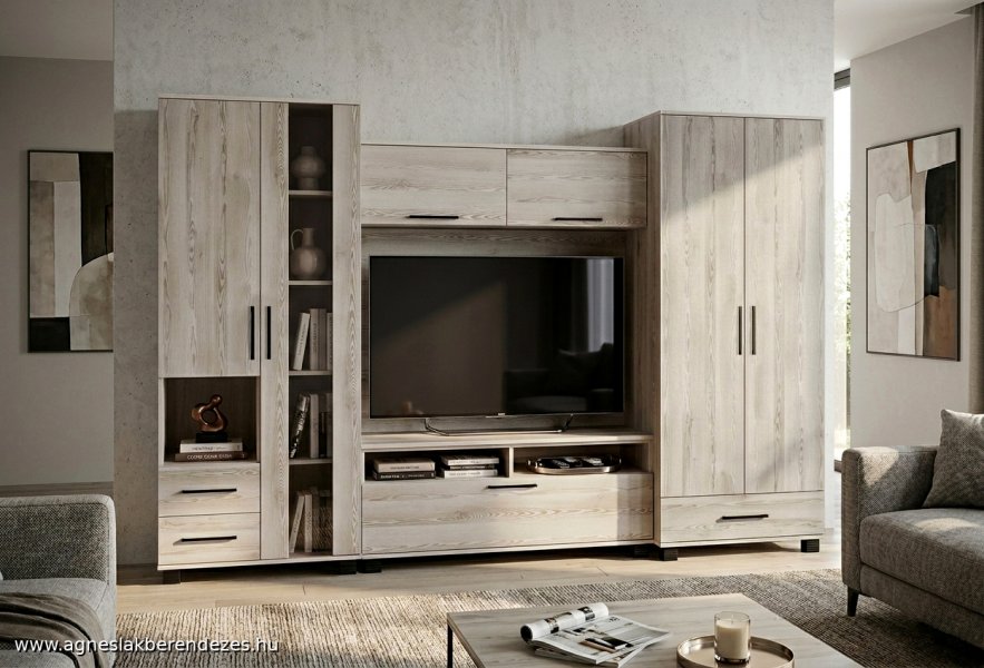 Praktikus, jól pakolható szekrénysor két akasztós szekrénnyel. Szín: sonoma tölgy, matt sötétszürke, vagy fehér üvegkeret és fiók elő.