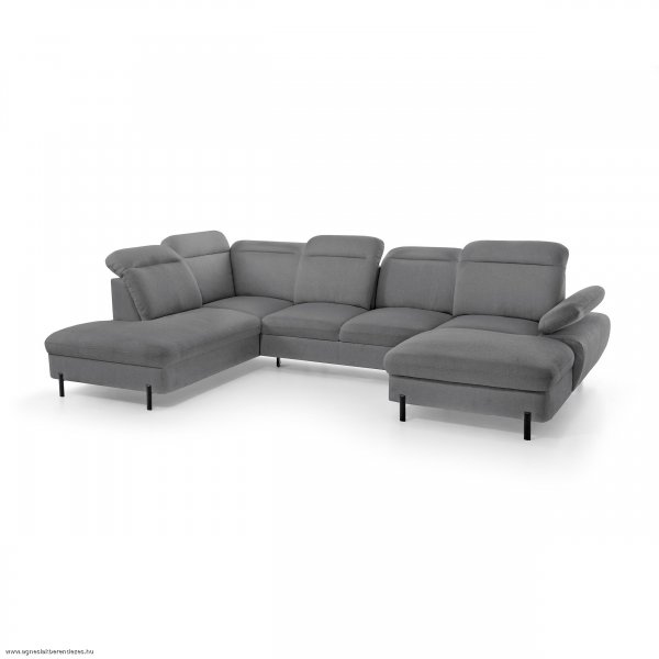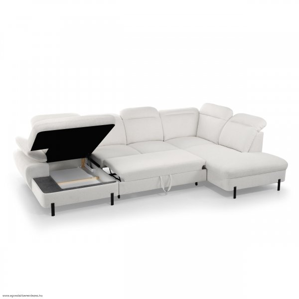 Modern hullámrugós sarokgarnitúra állítható ülésmélységgel, fejtámlával, karfával. Ágyazható, ágyneműtartóval dekoratív tűzéssel kárpitozott háttámlával fekete lábakkal. Szövetminta alapján jobbos vagy balos állásban rendelhető. A fekvőfelület mérete: 280cm x 135cm