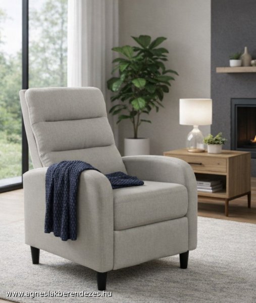 Modern letisztult formájú relax fotel, könnyed működtetésű push-back technikával működik:egyszerűen hátradőlve aktiválódik a lábtartó és a dönthető háttámla. Szürke és bézs színben rendelhető a készlet erejéig.